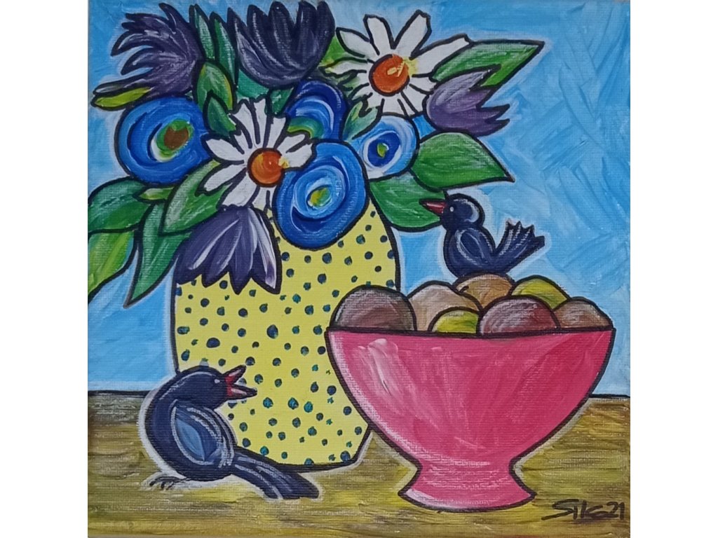 Malý, veselý obrázek dvou ptačích bratrů je namalován na plátně nataženém na dřevěném rámu. Obrázek je ošetřen závěrečným lesklým lakem, který obrázek nejen ochrání, ale krásně rozjasní barvičky.